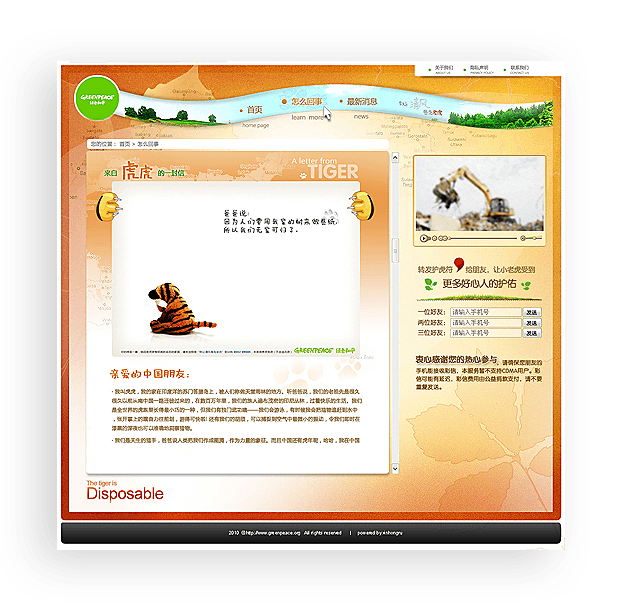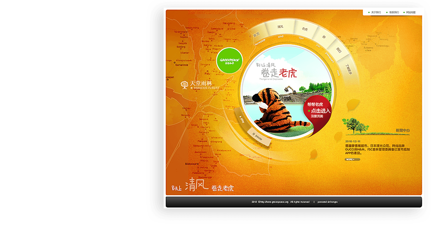 绿色和平网站举办《别让清风卷走老虎》等多个线上公益活动,吸引用户参与。D体育(中国)·官方网页版长期负责其网站的维护和运营推广工作,保障网站稳定、有效运行。