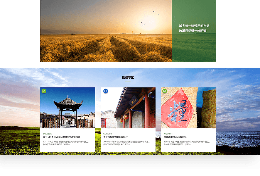 中储粮官网采用扁平化ICON的方式,集中展示储备管理、轮换购销、专项调控等多元业务,在保证用户便于阅读的基础上,通过创意、交互吸引用户关注。