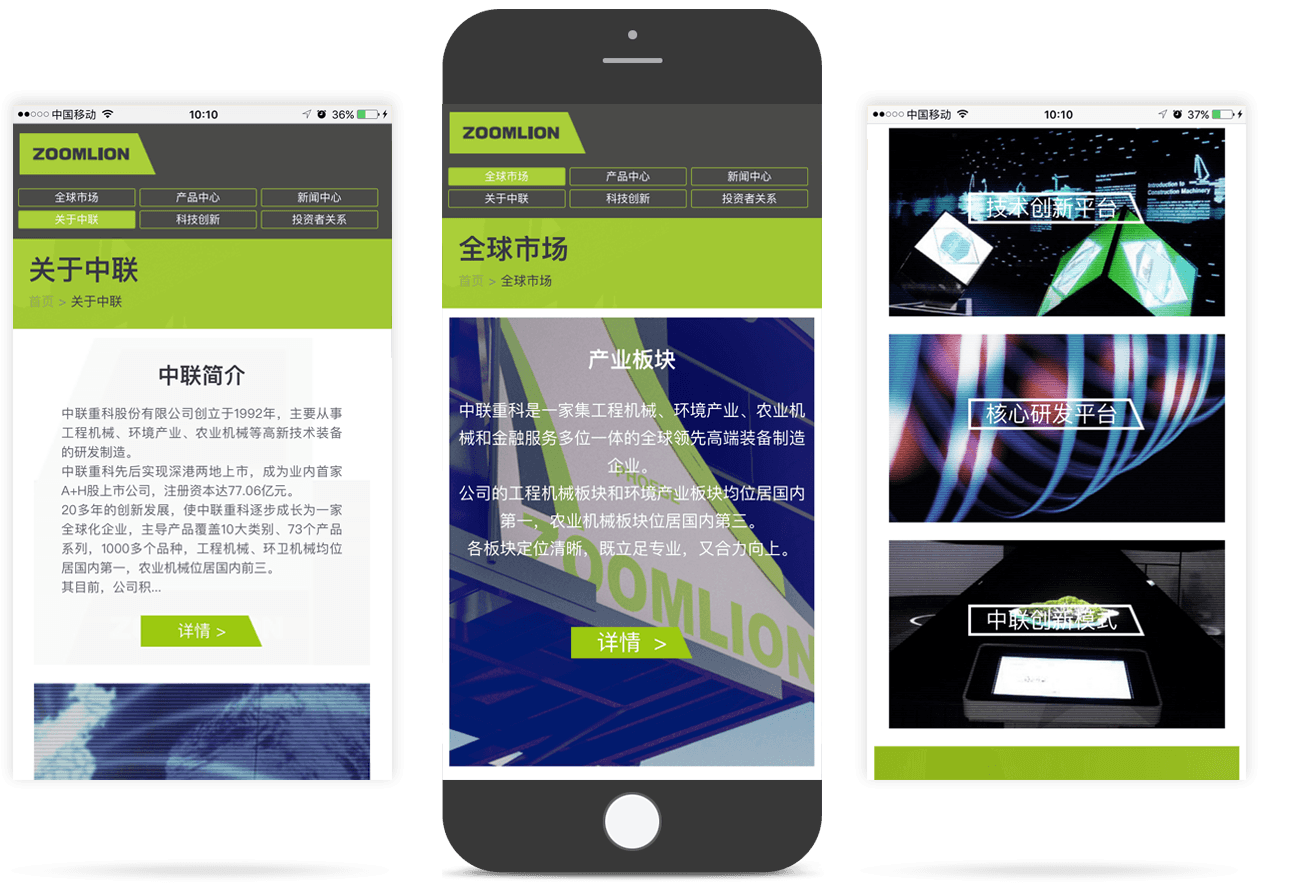 网站针对【关于中联】频道采用图片、文字、视频等多种元素结合的表现方式,塑造更加立体、多元、多维度的企业形象。视频的创新应用结合视觉、听觉等多重感官, 丰富用户的浏览体验。