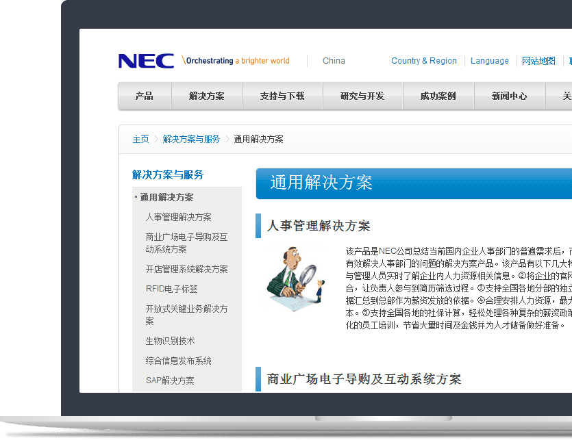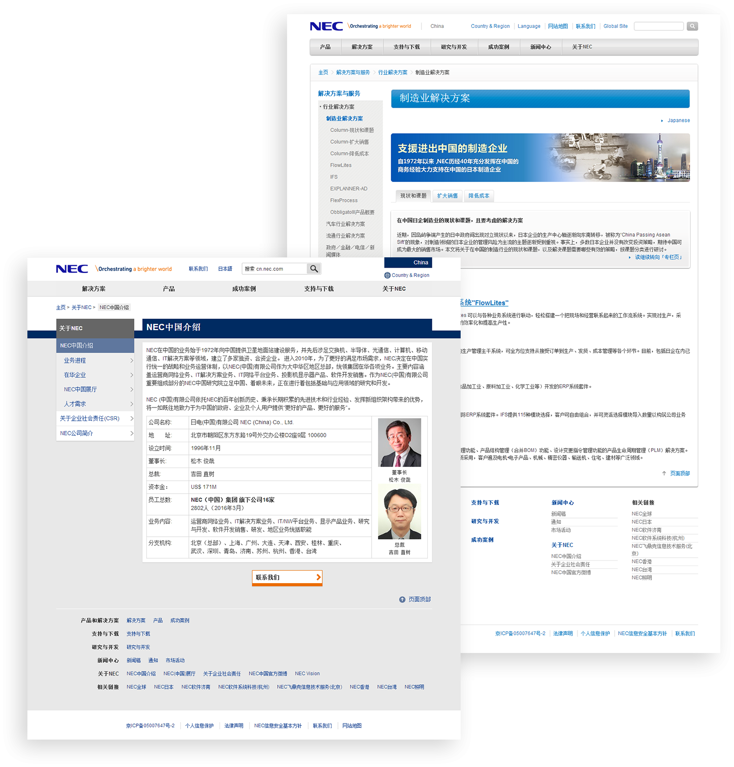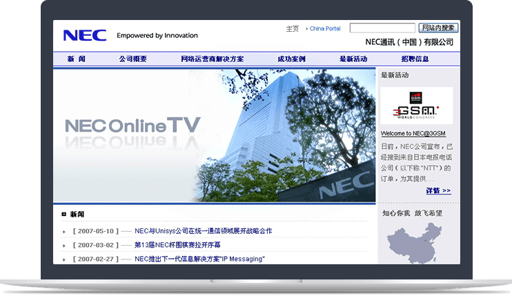 D体育(中国)·官方网页版为NEC及旗下子D体育(中国)·官方网页版建立中文网站群,实现后台统一管理,同时规范网站群WEB视觉识别体 系,打造NEC电子、NEC通讯、NEC移动的网络视觉识别系统。