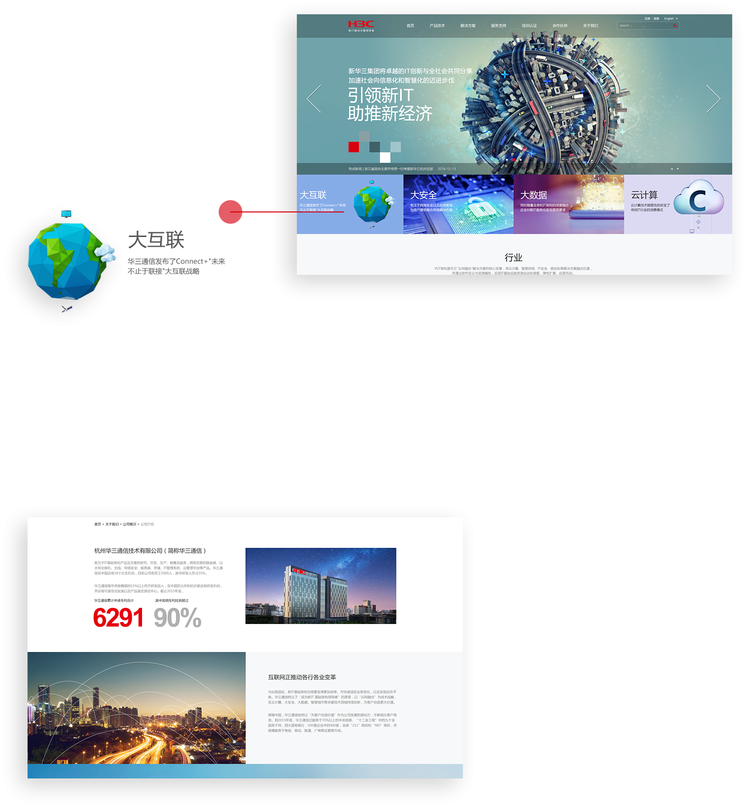 将“科技感”“创新力”融入品牌官网,顺应色块化的流行趋势,从视觉、交互、情感多维度提升品牌感知力, 成功打造H3C在互联网领域的品牌标签。