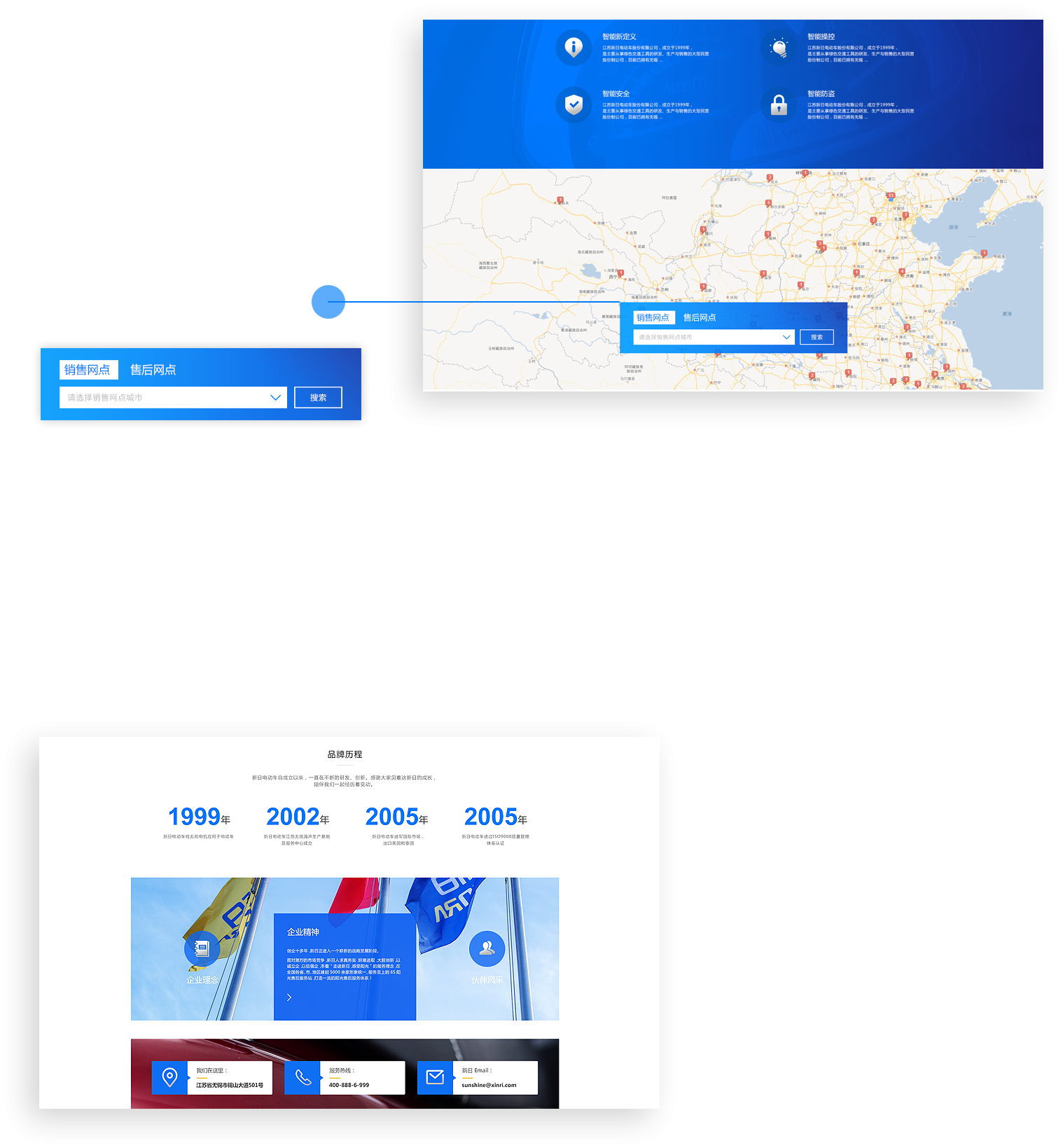 新日电动车官网调取百度地图实时数据,通过标签定位的方式,实现销售网点、售后网点的查询,极大的方便了用户,提升了服务质量和销售渠道。