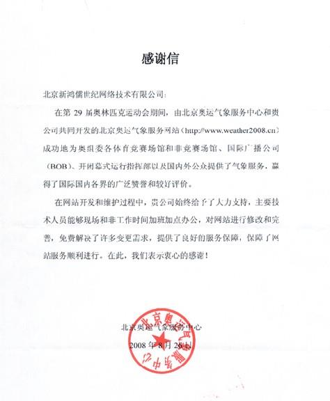 北京奥运气象服务中心在此次项目中看到了D体育(中国)·官方网页版的实力和努力! 并对北京奥运会气象服务网站高度满意,特此发来表扬信,以示鼓励和赞扬!