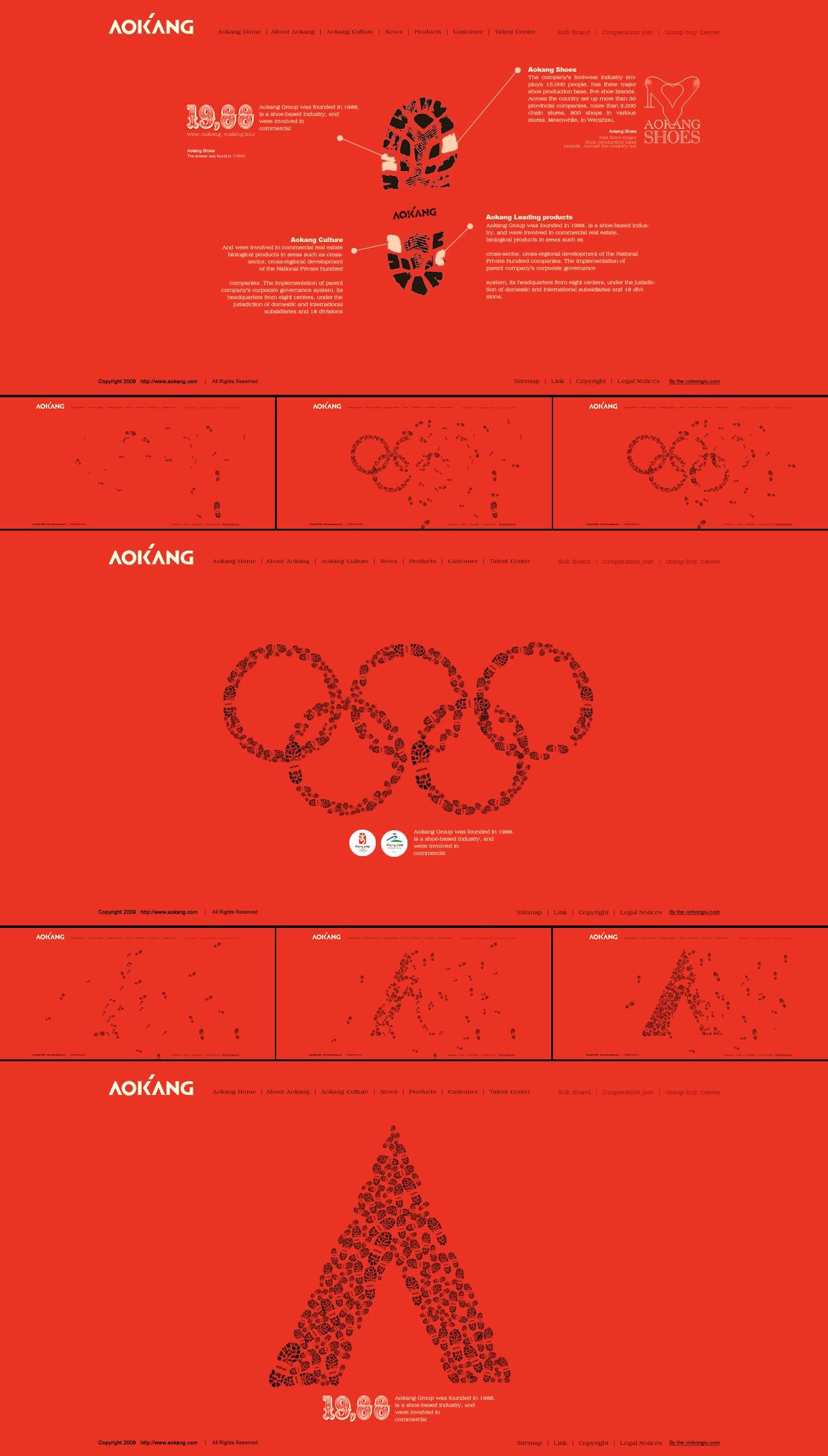 此次D体育(中国)·官方网页版承办奥康集团官网改版工作,根据其行业特性及品牌优势,设计并制作一系列D体育(中国)·官方网页版动画,因其颜色鲜明、风格独立、创意大胆而被业内专家及浏览受众广为关注。迄今为止,奥康网站已被多家创意、设计网站(互动社、SJ63、68design等)收录,并广受好评!
