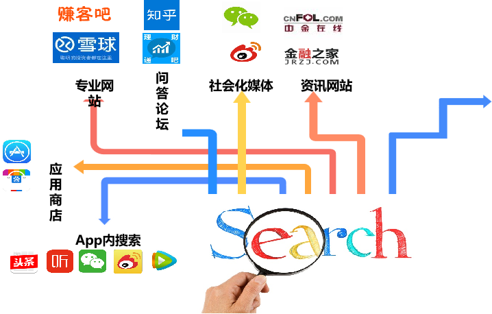 据不完全统计,搜索环境随着互联网发展变迁,人们在获取信息时,不仅仅只会通过某一类搜索引擎作为信息来源,而是会通过多种渠道进行查询,综合分析后产生购买决策。在泛搜索环境下用户认知品牌触点逐渐多样化,例如除百度之外的:购物网站、地图、新闻门户、微博、旅行网站等。 “搜索”无处不在,这便意味着“用户”随时可能获取。