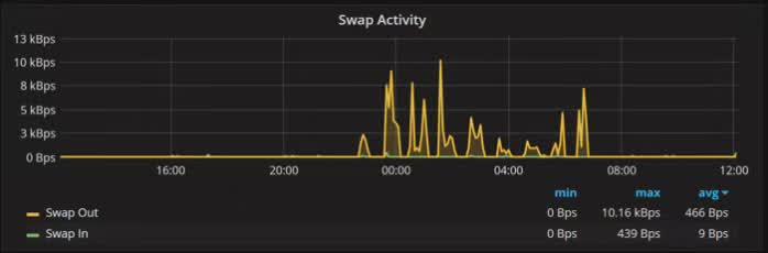 如图所示,如果你看到有大于 1MB 每秒的持续交换活动的话,您就需要减少缓冲池的大小了,或者使用其他的内存。