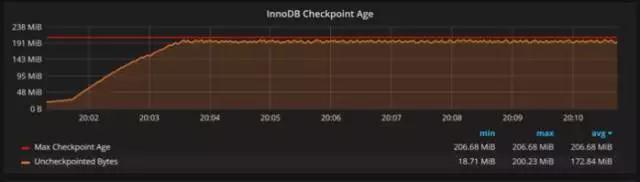 在下图中,InnoDB 的日志文件不够大,使用空间已经屡屡接近于可用的重做日志空间了,如红线所示: